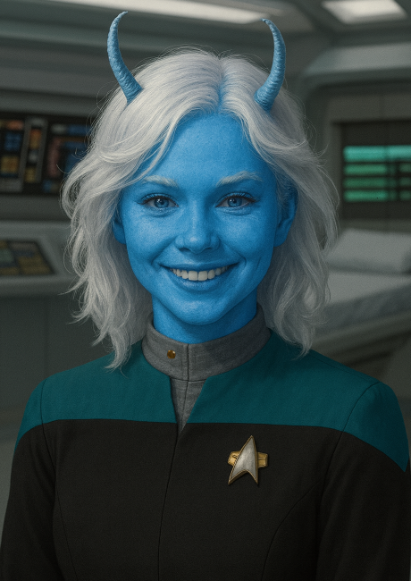 Mi primer personaje en Comunidad Umbría: una andoriana alférez de la Flota Estelar. La adopté en mitad de una partida, cuando un desalmado jugador la dejó abandonada en medio de Xerxes IV, un planeta asalvajado situado en ninguna parte a mano derecha. Que no os engañe con ese aspecto de Pitufina con cuernecitos. Bajo ese exterior azul y cuqui se esconde una médica talentosa y una oficial de moral intachable. Y también, paradójicamente, alguien a quien le gusta más una buena pelea que al capitán Kirk una jarra de cerveza romulana. Y es que, como dice el refrán, "puedes sacar al andoriano de Andoria, pero no Andoria del andoriano".
