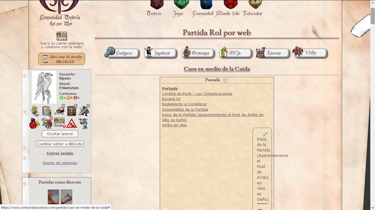 5.- Regrese a la Partida por su icono en el Menu "Partidas como Director" y observé que se habian restaurados las vistas de los escenarios; Ingrese al Primero Escenario que había creado (y como suelo siempre resguardar mis narrativas), volvi a postear pero con solo texto, sin anexos gráficos en los post para los jugadores, de manera que pudiera continuar con la partida.