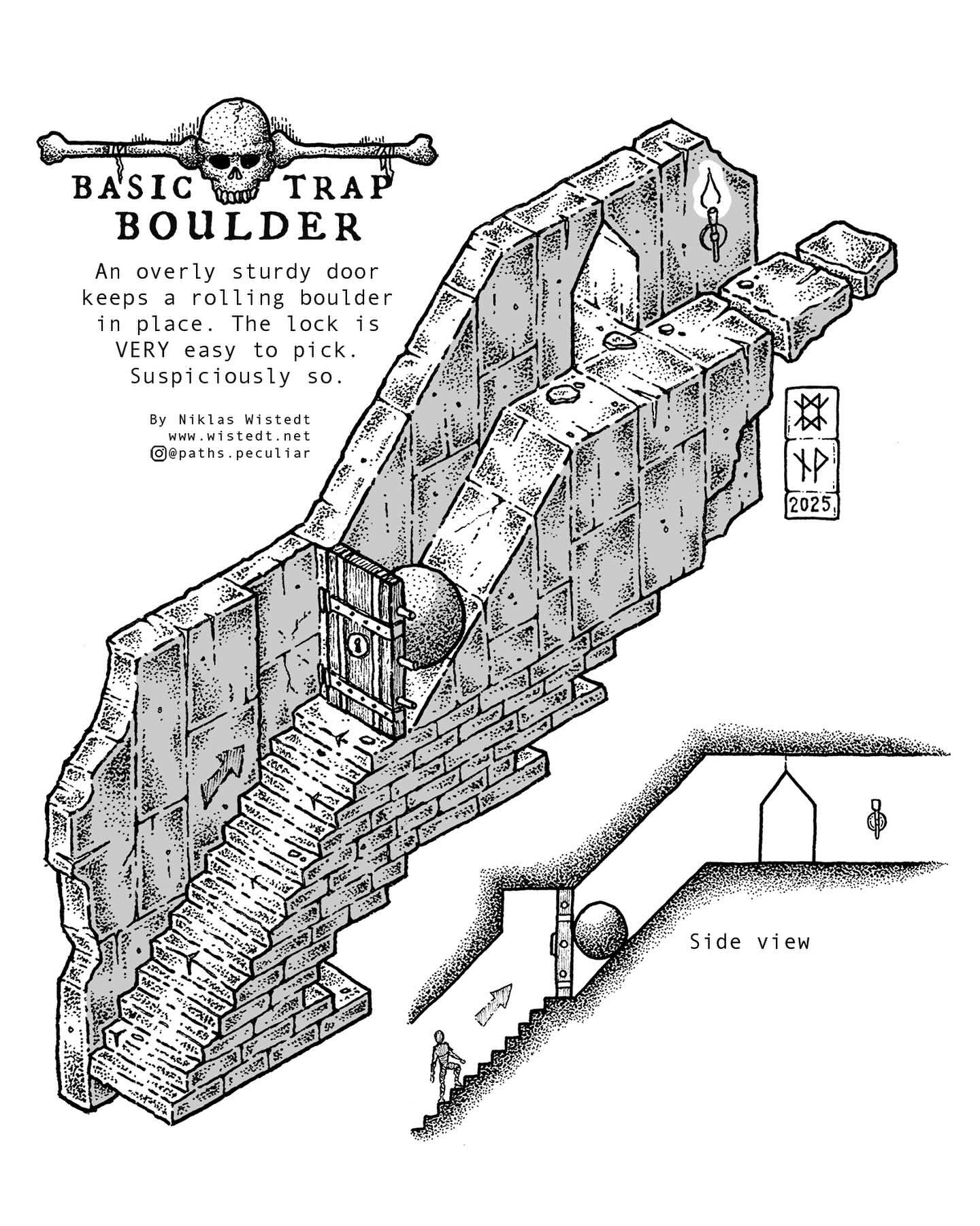 Ésta parece más fácil. Manual del pícaro profesional: primero siempre revisar cuidadosamente puertas y cerraduras antes de tocar nada. A través del cerrojo creo que se vería la roca rodante, desvelando que allí no hay ruta posible.