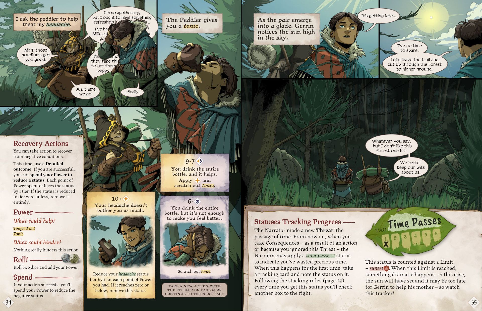 Ningún problema en enseñar la parte mecánica, además el reglamento es muy fácil de aprender. Podéis echarle un ojo a este resumen que he hecho para mi otra partida, que usa el mismo sistema, pero en un setting cyberpunk. En la versión de Legend in the Mist hay algunos cambios menores, pero aquí os podéis hacer una idea bastante buena.