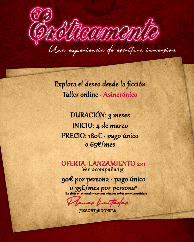 Para el próximo taller he decidido usar el foro como herramienta central de trabajo. Estoy cerrando la primera edición de Eróticamente y en marzo inicio una segunda, ambientada en el País de las Maravillas.