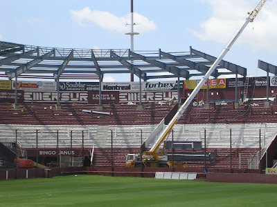 Y arriar al pobre ser humano hacia la cima del codo de la tribuna, ante la mirada atenta de los policías que no entendían por qué dos personas en vez de salir, como todas las demás, subían hasta la parte más alta a pararse al lado de una columna y a... sacar fotos con una hoja de papel. Lo mejor en realidad fue que mi padre me dio su móvil para que sacara la foto que quisiera, y yo tuve que arremeter con un tímido: "Eh... no, necesito que vos me saques la foto. Sí. Yo salir. Y que se vea la cancha. Bueno, sí. Es una foto para..."