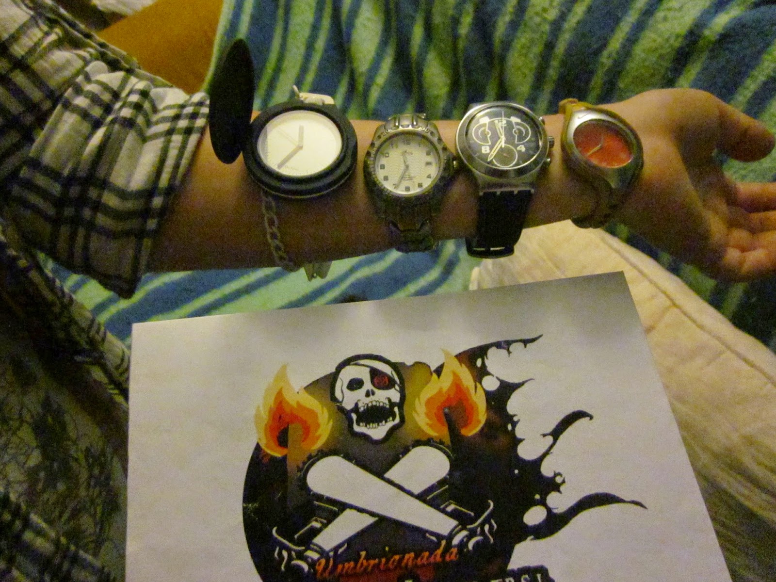 "Con al menos cuatro relojes en el brazo". Resulta que estaba yo ahí tan casual y me he dicho "tate, no sé qué hora es". Así que he mirado en mis pocos relojes de muñeca. No me los llevé a la KDD porque íbamos en coche, pero de haber ido en bus los hubiese llevado puestos.