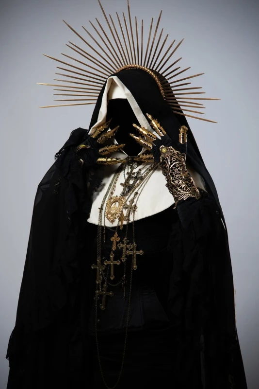 vestida con telas color café.