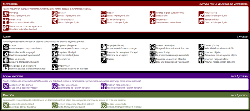 Las acciones más comunes que puedes realizar están descritas más adelante en la sección Acciones en Combate de este capítulo. Muchas características de clase y otras habilidades proveen opciones adicionales para tu acción.