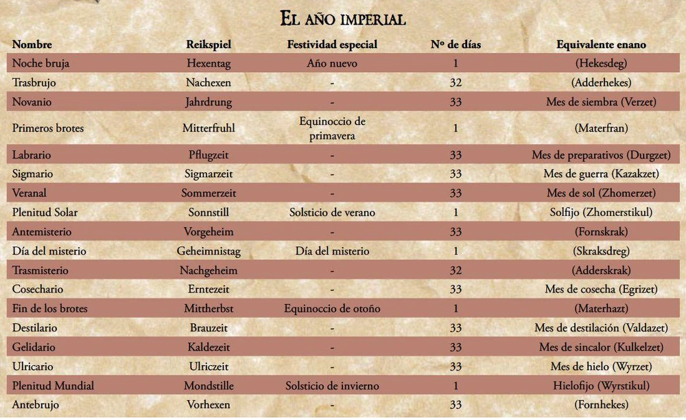 El Mundo de Warhammer tarda 400 días en dar una vuelta completa a su estrella, que es mucho más grande y caliente que nuestro Sol. Es orbitado por dos lunas, que en el Imperio tienen los nombres de Mannslieb (Amada de Manan, con un período de 25 días) y Mórrslieb (Amada de Mórr, período irregular). Pese a que en el Mundo de Warhammer cada raza tiene su propio calendario (como el Orco, que es "hoy", "ayer", "haze díaz", "mañana" y "dezpuéz de mañana", el más usado es el Imperial. Éste se divide en 12 meses de 32 ó 33 días, más seis días independientes entre meses. Cuatro de estos días están relacionados con el cambio de las estaciones, mientras que los otros dos indican el momento en que las dos lunas están llenas. Estos dos días tan especiales son muy temidos por los extraños sucesos que se dice que tienen lugar en ellos, y son el Hexensnacht (la Noche de las Brujas) y el Geheimnisnacht (la Noche de los Difuntos). La semana imperial tiene 8 días.