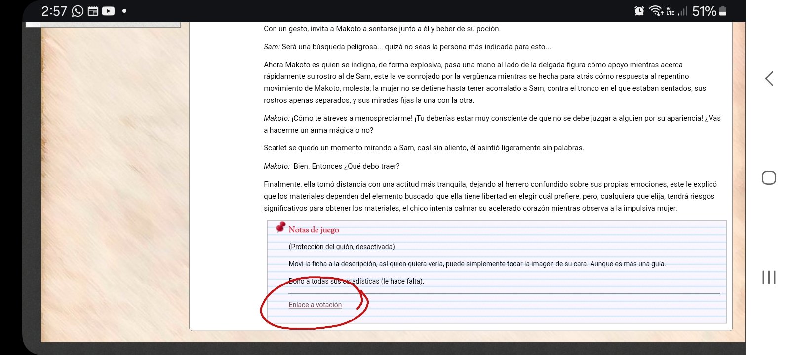 Normalmente, al fondo de todos mis post, escribo "Enlace" "Votaciones" o algo similar, siempre está subrayado y normalmente tiene un color diferente, al darle clic, te llevará a una encuesta en Google, y si no estás trabajando desdé una cuenta Google, te pedirá que ingreses. Eliges la opción que te guste y listo, por ahora ya cerré todas las encuestas anteriores, ahora hay que elegir un elemento para un arma mágica, quizá quieran sugerir que elemento se debería elegir.