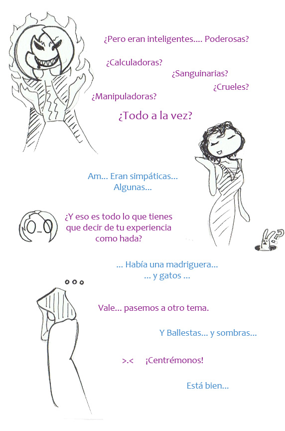 - Tras eso, Shiobán… autoproclamándose Vidente… declaró que había observado a… ¡Hó!, ¡Sorpresa! (ironía) A la pequeña Kuvia, descubriendo la condena en su sangre y un ánimo asesino que persuadiría a cualquiera que jugase en su contra