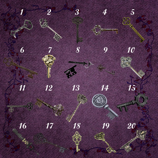 Así pues... Tenemos ambos objetos. Las llaves, para representar a los personajes y los candados para representar eventos y/o aumentos de poder de los personajes cuya llave escojan. Dos llaves rotas por los personajes que ya estaban abandonados en este momento de la partida. Dos llaves de más trampa que lanzarán eventos especiales sin necesidad de encajarlos en ninguna cerradura, mas una llave secreta.