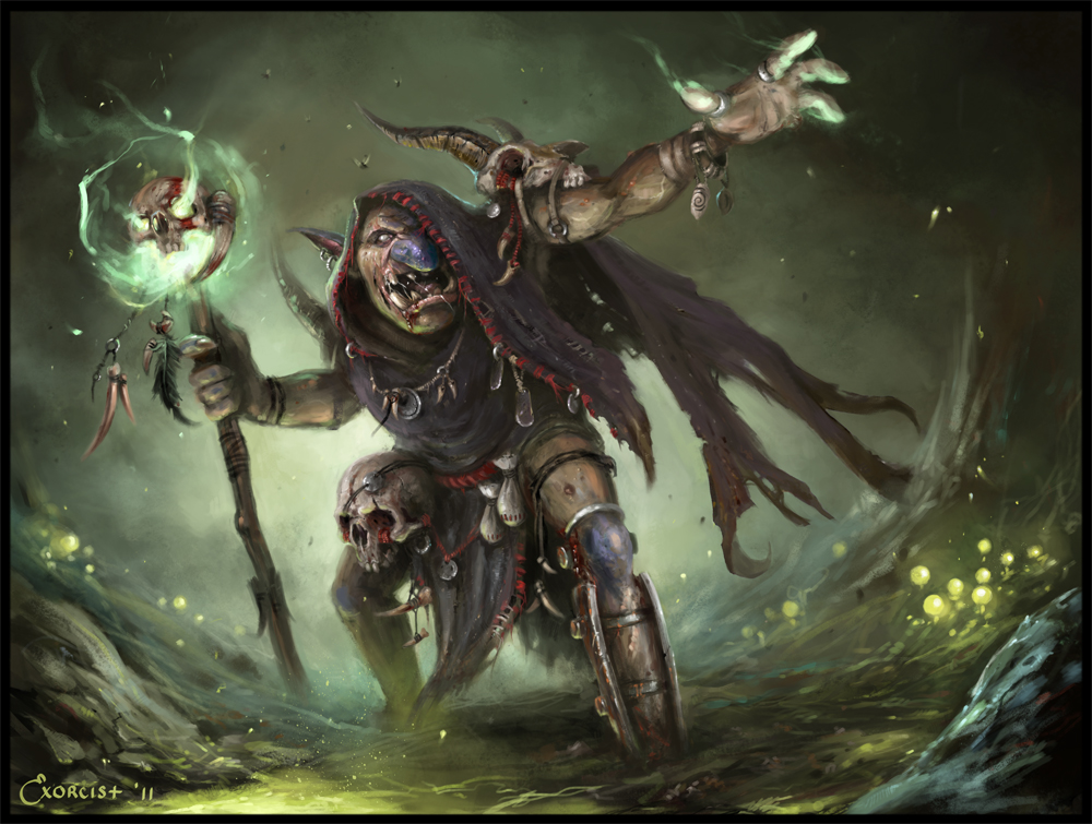 Mago trasgo 8 Fue 8, Des 12, Con 14, Int 16, Sab 14, Car 6 Spells Equipo: Baston +1, Anillo +1, Amuleto de armadura natural +1, Varita de proyectil mágico, 3 pociones lvl 2, 3 pergaminos lvl 2, bolsa de componentes de conjuros. Nota de combate; Caballus habrá usado sus spells de daño fuertes para romper la empalizada (bolas de fuego). Ahora se concentrara en enviar a sus hombres primero, atacando a distancia con proyectil mágico o flecha acida a los que vea mas peligrosos, o si se le aproximan rociada de color. No luchara en melee hasta estar rodeado, y si va perdiendo primero conjurara Globo menor sobre si mismo. Cuando muera, murmurara unas palabras y un cuervo escondido entre los maderos alzara vuelo, llevandolas. |