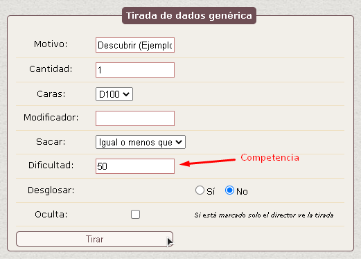 A no ser que se diga lo contrario en su descripción, cada competencia tiene un porcentaje base igual al valor que tengamos en la característica de la que depende, que es la que aparece junto al nombre de la competencia entre paréntesis. Algunas de las competencias se describen como Competencias de Armas de Villano, Soldado o Noble —de las que hablaremos en el capítulo de combate— (Personalmente pido muchas tiradas combinadas aun cuando en la descripción de las competencias da a entender que no es necesario aun cuando en la acción a realizar esta claro que se usarían dos competencias, un ejemplo seria usar la competencia rastrear para seguir a alguien en sigilo sin perderle el rastro donde en mi opinión debería usarse alguna competencia para seguir de forma discreta a esa persona, como Sigilo o Ocultar o disfraz. Claro que por ser flexible solo coloco un ligero penalizador en algunos casos donde no sea tan necesario una segunda competencia)
