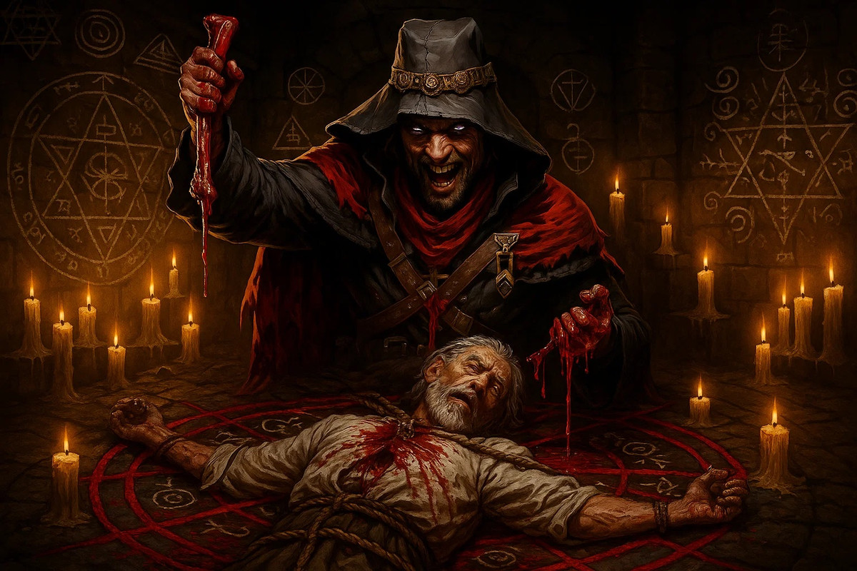 Con la seguridad de sus nuevos peones, Edric arrastró el cadáver de Grundar hasta las entrañas de la posada: El Último Refugio. Allí comenzó a preparar un rito blasfemo. El Barón Cuervo, su amo y mentor en la sombra, lo había guiado hasta este punto: un sacrificio familiar que abriría la grieta. El propio Tophom, su padre, habría de ser la víctima. Su muerte alimentaría al Barón, quien a cambio revelaría el conocimiento necesario para invocar a Nergal y con ello romper la prisión que lo mantenía encadenado a Kravemir.