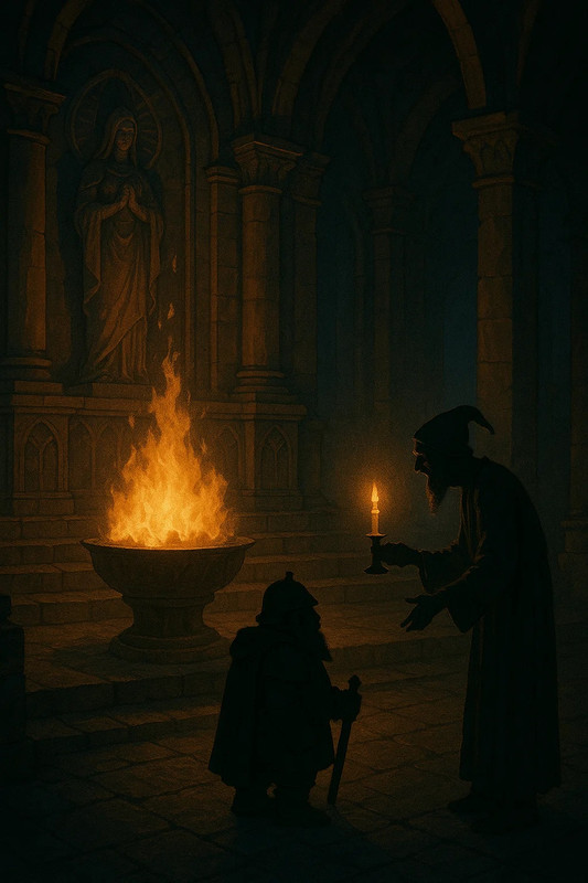 El Padre Gregor abrió la estrecha puerta lateral con un respingo, la vela temblando en su mano y proyectando sombras largas en su camisón blanco y su gorro de dormir ligeramente ladeado. Con los ojos aún algo vidriosos por el sueño, reconoció al instante la figura del alguacil y enderezó la espalda con una mezcla de sorpresa y preocupación.
