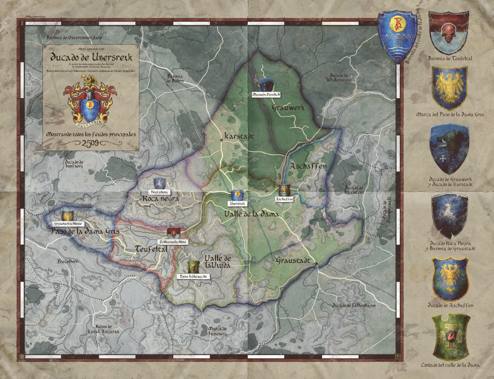 Ubersreik es una de las joyas más brillantes de la corona de Reikland. El magnífico puente de la impactante población fortaleza es a la vez una espectacular obra de ingeniería y un símbolo duradero de nuestra alianza con los enanos. Conecta sus intrincadas carreteras, ríos y canales con las vías de comunicación del vasto tejido mercantil que abarca todo nuestro Imperio, haciendo de ella un centro de comercio sin rival.