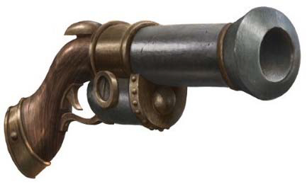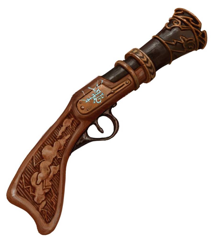 Esta arma mágica a distancia es una pistola acampanada con la runa de la tormenta grabada a lo largo del cañón. Obtienes una bonificación de +1 a las tiradas de ataque y daño realizadas con él. No requiere munición, su daño es trueno en lugar de perforante y no tiene la propiedad de recarga.