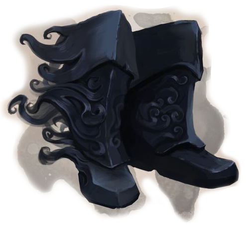 Este par de botas está hecho de tela duradera, con la runa de viaje cosida en hilo dorado sobre cada talón. Mientras llevas este objeto, tu velocidad al caminar aumenta en 10 pies y tienes ventaja en las pruebas de Sabiduría (Supervivencia).
