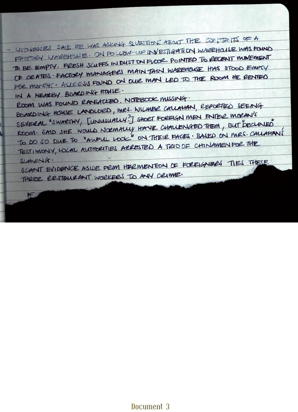 Testigos afirman que había estado haciendo preguntas acerca del contenido de un almacén de la fábrica. En la consiguiente investigación, se descubrió que el almacén estaba vacío. Roces frescos y marcas de polvo en el suelo sugieren un movimiento reciente de cajas. Encargados de la fábrica sostienen que el almacén ha permanecido vacío durante meses. La dirección encontrada en nuestro hombre conducía a la habitación que había alquilado en una pensión cercana. La habitación había sido saqueada. Cuaderno desaparecido. La propietaria de la pensión, la Sra. Wilmer Callahan, informó haber visto a varios hombres inusualmente (¿?) morenos, bajos, extranjeros" entrar a la habitación de Moran. Dijo que normalmente los habría confrontado, pero que se negó debido a una "mirada horrible" en sus caras. Basándose en el testimonio de la Sra. Callahan, las autoridades locales arrestaron a un trío de chinos por el asesinato. La falta de pruebas, aparte de su mención de que eran extranjeros, relaciona a estos tres trabajadores del restaurante con cualquier crimen.