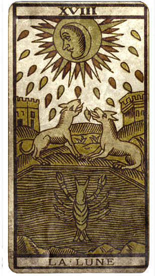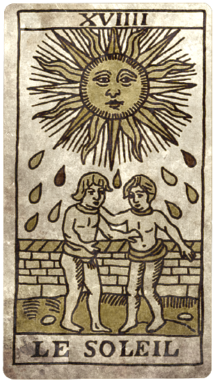 Gretel hizo una pausa para deslizar una carta hacia la callosa mano del brujo. Parecía mostrar un enorme sol radiante y a dos gemelos delante de una muralla: